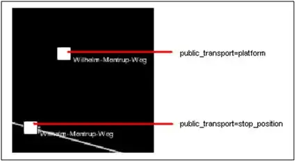 public_transport=platform besteht. Bei der Platform kann es sich wie bei einem Bahnsteig auch um eine richtige Platform also um eine Linie handeln. Diese verhält sich aber genau so wie der Node später in der Relation.