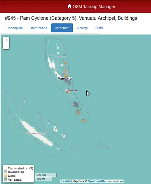 March 14 - Individual members of HOT began monitoring the Pam Cyclone. March 15 - After 20 hours, all residential areas and roads where traced for a the islands affected (extent of 650 km from north to south). While validating, instructions were givien to spot communication towers and eventual helicopter landing fields.