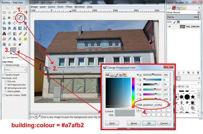 4. Copy the value and paste it with #before copied HTML notation as tag building (or roof):colour=* in your OSM editor.