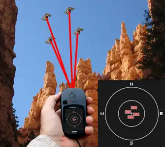 Highly clustered satellites can result in large positional errors, up to several hundred meters. Although there is little that can be done to improve the situation in enclosed spaces, it is worth keeping an eye on your GPS device so that you are aware of when the signal quality drops. Look for a "satellite view" diagram (as shown in the images on the right) on your device.
