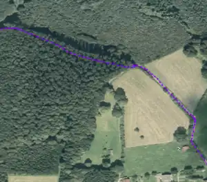 Even when the object is less substantial (tree cover, car roof, your body), reflection and weakening of signals may still occur. This can sometimes be observed when viewing your recorded GPS track logs on top of aerial imagery. In the image on the left, the true position of the footpath follows the shadowy area in the forest. However, as the GPS receiver enters the forest (walking from east to west), it can be observed that reflections cause the recorded track to incorrectly shift slightly to the south.