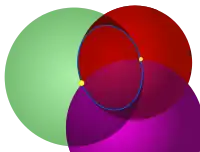 If the GPS unit only receives a signal from the "Green" satellite, then it can only determine that its location lies somewhere on the sphere of all locations that are the same distance from the "Green" satellite (as shown as the green sphere in the diagram above). Now consider the case when the GPS unit receives signals from both the "Green" and "Red" satellite. As before it determines its distance from each satellite. As we have received two signals we can narrow the location down to those points where the two individual distance spheres intersect. This means the location must be somewhere on the blue circle as shown in the diagram. |