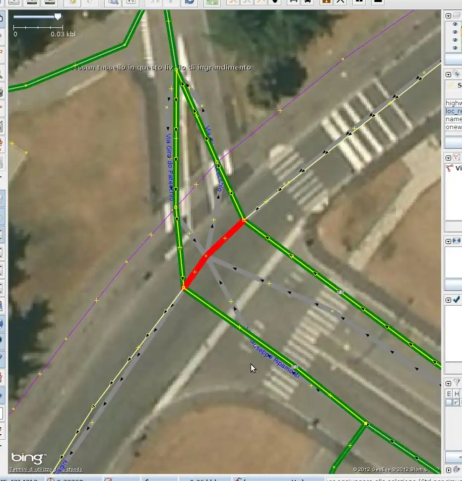 - Gli archi devono essere interrotti in corrispondenza delle intersezioni tra strade-strade e strade-tram; non vanno interrotti nelle intersezioni tra strade e non-strade (footways, power, altri oggetti lineari).