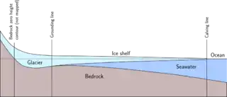 The ice shelves around Antarctica are thick plates of ice (thickness of 100m and more) which exist at 44 percent of the antarctic coast. More details can be found on Wikipedia. How exactly this looks like in principle and where the various lines talked about in the following are can be seen in the image on the right.