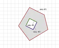 Areas may also be defined with relation:multipolygon as a set of ways which define one or more outer boundaries, and optionally zero or more inner boundaries ('holes'). In the example below there is one outer boundary defined by a single way, and two ways as inner: