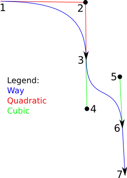 In this example nodes 1 and 3 are connected through control point 2 (a quadratic); nodes 3 and 6 are connected through control points 4 and 5 (a cubic); and nodes 6 and 7 form a straight line (no control points between). More control points could be added in the future for higher-order curves. For now the API could limit it to only quadratic and cubic curves. Control points could be implemented as nodes with lat/lon, but there should be no need to add tags to them.