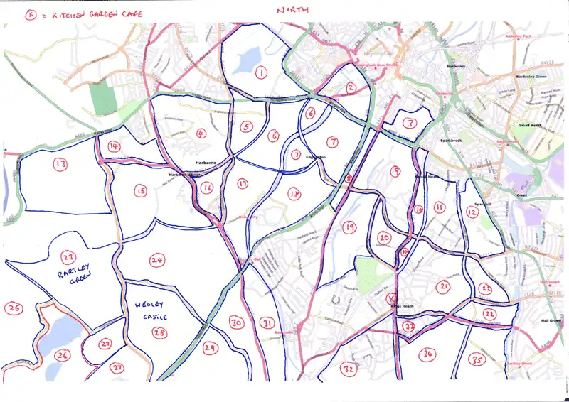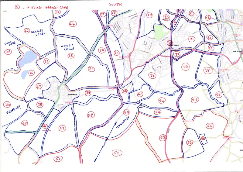 These two images show the areas of south and southwest Birmingham that are yet to be mapped. Each numbered area is or no particular size but generally each has logical boundaries of major highways, canal or railway. Areas with a red boundary are non-urban. The first image is the area around the venue plus that to the north. The second image is the area around the venue plus areas to the south. There is some overlap between the two images so that those attending can refer to the two at the same time. Blackadder has printed B&W zoom 15 blow-ups of each area that can be used during the weekend.