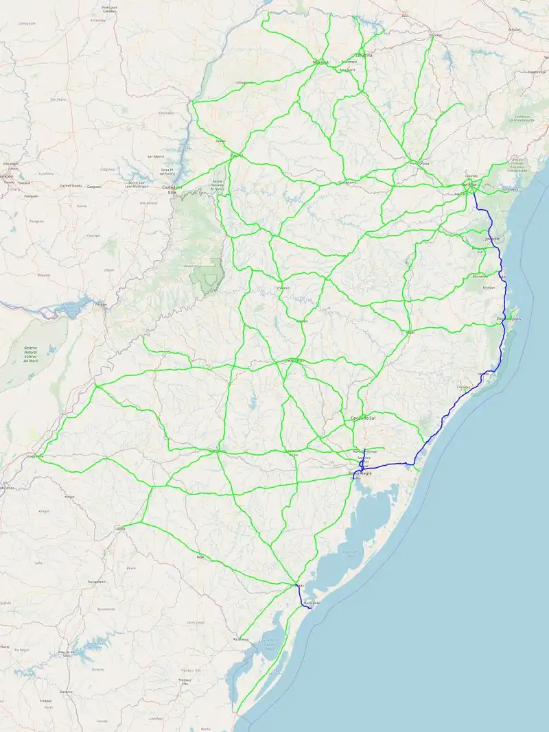 Aplicando os estudos das rotas do Rio Grande do Sul para definir as rodovias com categoria primary ou superior, obtém-se, a princípio, o mapa a seguir (primary em vermelho, trunk em verde, motorway em azul). É possível que algumas rotas tenham que ser ajustadas, mas o mapa final não deve diferir muito do exposto.