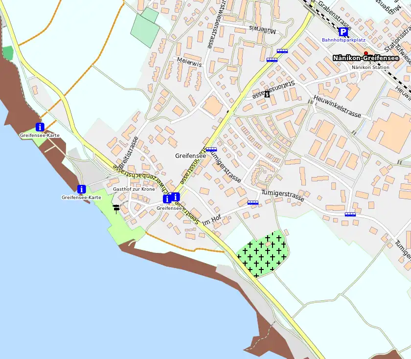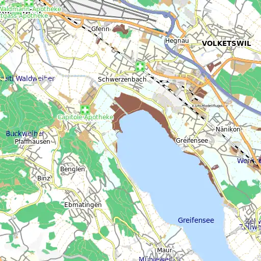 oom level 13 in the vincinity of Zurich, Switzerland. Showing off ways, labels for nodes and areas, and the image-icon for pharmacies.