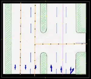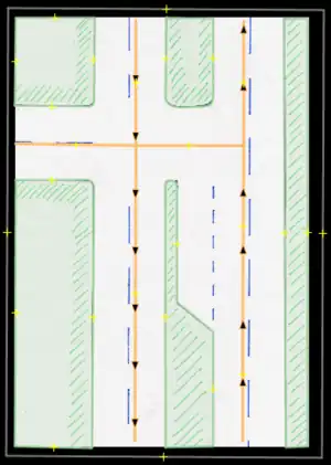 Roads that lead to or cross a ciclovía must be modified to include turning restrictions. In order to be able to map the segments correctly, it is recommended to split the road segments, at most up to the previous or next corner of the restriction node. This prevents to have relation members that span several blocks, which, if modified, can damage the constraint. These restrictions may seem somewhat redundant and unnecessary, but they strengthen the mapping of the ciclovía, and prevent routers from generating a route through the ciclovía corridors during their schedule.