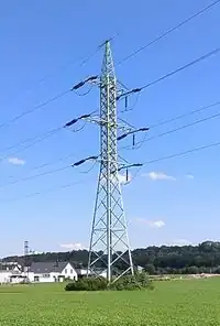 Vedení VVN 110 kV, na první pohled jsou vidět mohutnější a delší izolátory pro vyšší napětí.