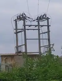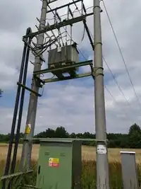 Sloup s transformátorem "vše v jednom", který se často dává když je potřeba přidat transformátor doprostřed vedení. Obsahuje jak vlastní transformátor tak vypínač: