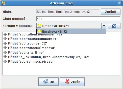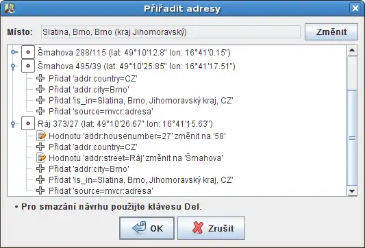 Uvedený dialog je vhodné používat i na oblasti, ve kterých existují adresní body z dřívějších masových importů. Ty totiž neobsahují některé užitečné tagy jako např. is_in=*, addr:city=*, nebo addr:country=*.