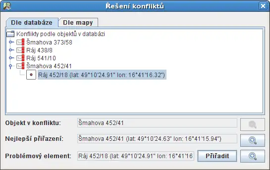 Z menu vyberte AdresyPřiřadit adresy. Tento dialog prochází všechny relace (včetně těch, které vznikly manuálně vyřešením konfliktů) a snaží se upravit mapu tak, aby přesně odpovídala elementům v databázi. Příklad, jak takové přiřazení může vypadat je na následujícím obrázku: