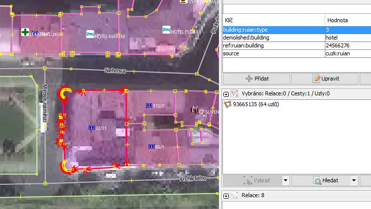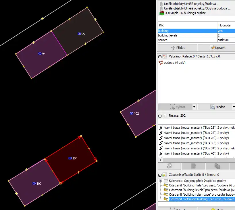 - Někdy se vyplatí natrasovat i ty budovy, které už pocházejí z RÚIANu, ale pomocí dřívější verze traceru. Ta novější totiž přidává i počet pater, počet bytů a přesnější hodnoty tagu