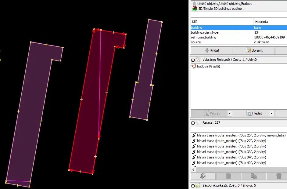 - b) pokud není obrys moc přesný, tak natrasovat a zase rozdělit na jednotlivé budovy (všechny budou mít stejný tag