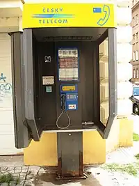 Telefonní budka nebo telefon na zdi či stojánku. Obvykle za použití platíte, často pouze pomocí telefonní karty.