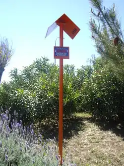 Značka indikující cestu podzemního vedení připevněná na sloupku, zdi, podstavci, atd. S různými kryty a barvami. | |