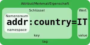 • addr:street=* und addr:city=* sind zwei Schlüssel mit dem Namensraum addr. Damit können zusammengehörige Werte gruppiert werden, wie z. B. die Teile einer Adresse.