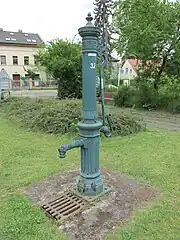 Andere Lackierungen als das verbreitete Chromoxidgrün sind verbreitet, so eine grüne Säule mit blau lackiertem Wasserauslauf und Handschwengel... -