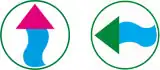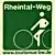 Symbol: viertel Rad mit Speichen und Achse weiß auf rotem Grund (Hauptroute) bzw. auf gelbem Grund (Transversalen)