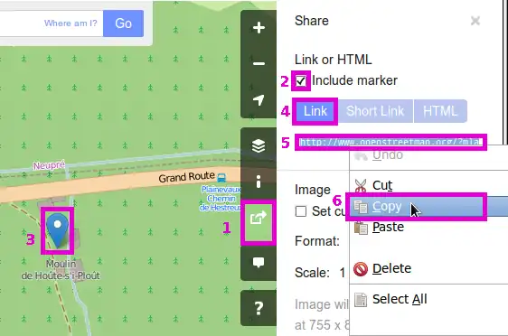 - Klicke in das URL-Feld direkt unter diesen Knöpfen, dann wird die erzeugte URL automatisch ausgewählt (5). Kopiere nun die URL (beispielsweise durch Rechtsklick und »Kopieren«) (6).