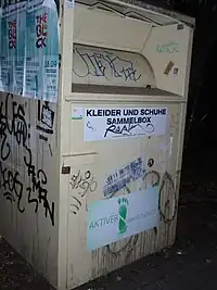 Einige Altkleider-Container tragen weder Aufkleber noch Beschriftung, die Rückschlüsse auf den Betreiber zulassen würden. Diese tragen stattdessen generische Aufkleber mit folgenden Texten: