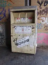 Altkleider-Container ohne Firmenkennzeichnung (weiß) Altkleider-Container, Firma unbekannt, Aufkleber: "Genehmigte Sammlung Berlin", Farbe: grün Altkleider-Container, Firma unbekannt, Aufkleber: "Schenken Sie ein Lächeln", Farbe: weiß Altkleider-Container, Sammelstation, ohne Betreiberkennzeichnung, Farbe: weiß Altkleider-Container, ohne Betreiberkennzeichnung, Schild: "Gebrauchte Bekleidung Schuhe", Prägung linke Seite: "PR", Aufkleber: "Bei Reklamation: Mobil: 0151 / 53248320, e-mail: container.infoservice@gmail.com", Farbe: gelb Altkleider-Container, ohne Betreiberkennzeichnung, Schild: "Achtung Schuhsammlung Altkleider", Farbe: Gelb