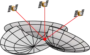 Durch Messung der Laufzeit des Satellitensignals kann der Abstand berechnet werden. Mit dem Abstand als Radius vom Satelliten als Zentrum ergibt sich eine Kugelfläche, auf der sich die GPS-Antenne befindet. Der genaue Standort ergibt sich als Schnittpunkt von Kugelflächen.