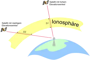 Das Signal eines hoch stehenden Satelliten quert die Ionosphäre fast senkrecht, die Atmosphäre ist dort weniger bzw. minimal "dick". Weiter gibt es durch den geringen Einfallswinkel fast keine Brechung des Signals. Der Fehler ist also eher klein bzw. minimal. Bei einem niedrig über dem Horizont stehenden Satelliten muss das Signal aber, durch den schrägen Verlauf, einen längeren Weg durch die Ionosphäre zurück legen, was zusätzlich zu einer noch größere Refraktion führt, die dadurch das Signal stärker stört. Außerdem benötigt das Signal dafür mehr Zeit, was eine zusätzliche Positionsungenauigkeit erzeugt DOP.