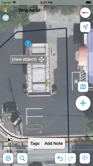 Ein Drücken auf das "+" Symbol erzeugt eine neue Node für einen Point of Interest. Ein Marker taucht auf und zeigt die Position der neuen Node. Mit der grauen Textbox kann die Position korrigiert werden. Mit dem Konfigurations-Symbol (blauweiser Pfeil) erreicht man die Tags. Werden keine Tags eingegeben, wird die neue Node wieder gelöscht. Bei versehentlich erzeugten Nodes reicht es, irgendwo zu Tippen, damit sie wieder verschwindet.
