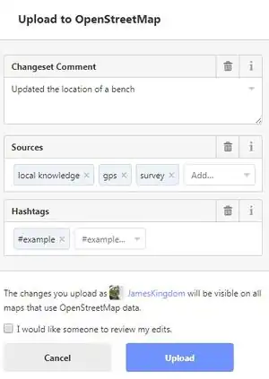 Der Kommentar, den du dort eingibst, wird zusammen mit deiner Bearbeitung in verschiedenen Situationen angezeigt, zum Beispiel, wenn jemand sich die Versionsgeschichte eines Objekts anschaut oder sich alle Änderungen, die ein bestimmtes Gebiet betreffen, anschaut.