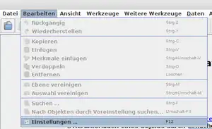 Bevor wir beginnen, sollten ein paar grundlegende Einstellungen vorgenommen werden, damit wir mit den selben Voraussetzungen anfangen können. Rufe als erstes nach dem Start von JOSM die Voreinstellungen auf, indem du im Bearbeiten-Menü auf den Eintrag "Einstellungen" klickst.