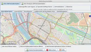 OSM-Daten ebenso wie GPX-Dateien lassen sich direkt aus einer Datei laden. In der Regel wird man OSM-Daten aber vom Server beziehen. Dazu wählt man Datei — Daten herunterladen, und es öffnet sich eine Dialogbox.