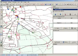Wähle eine Straße an, hier im Beispiel im linken oberen Quadranten. Beachte in der Palette (rot markiert)"Merkmale/Mitgliedschaften" am rechten Rand die Attribute, mit denen die Straße versehen ist. Klicke weitere Elemente an, eine andere Straße beispielsweise, einen einfachen Punkt oder auch einen Punkt, der als Parkplatz, Restaurant oder Spielplatz gekennzeichnet ist und achte in der Palette "Eigenschaften/Mitgliedschaften" auf die zugewiesenen Attribute.