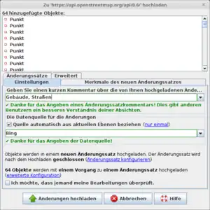 - Änderungen hochladen: Die Bearbeitungen müssen schlussendlich wieder auf den OSM-Server hochgeladen werden.