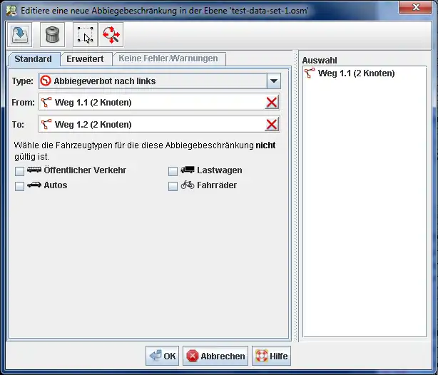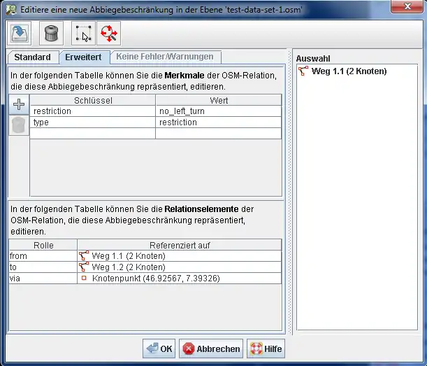 Das JOSM-Plugin turnrestrictions stellt einen Spezial-Editor zur Verfügung, um Abbiegebeschränkungen in OSM zu erfassen und zu pflegen.