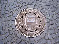 | Öffnung mit Abdeckung zum Einstieg zu unterirdischen Versorgungseinrichtungen, gerade so groß, dass ein Mensch hindurchklettern kann. |