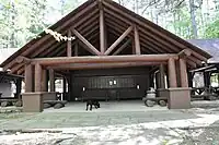 Eine Dach-Konstruktion, die auf Picknick-Plätzen Schutz vor schlechten Wetter bietet. Oft nach mehreren Seiten hin offen oder teiloffen. Auch oft mit innerhalb angebrachten Grill oder Holzofen. Es finden mehrere Tische darunter Platz. | |