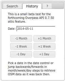 Diese oder ähnliche Fragen lassen sich im neuen Tabreiter Historie beantworten. Im Hintergrund verwendet die Historie ein neues Feature der Overpass API ab Version 0.7.50, die auch Daten aus vergangenen OSM-Zeiten (bis September 2012) bereitstellen kann.