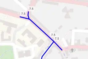 - Kein Knoten auf dem Weg unter der Brücke wurde mit maxheight getaggt. Damit der Knoten berücksichtigt wird, muss er nahe genug am Schnittpunkt liegen (ca. 20-30m).