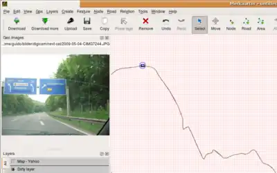 Es ist möglich, einen neuen Knoten in einen bestehenden Weg einzufügen, um ihm einen passenderen Verlauf zu geben oder um andere Details einzusetzen. Dazu wie oben dargestellt verfahren und den Mauscursor an diejenige Stelle des Weges bewegen, an welcher der neue Knoten eingefügt werden soll. Sobald sich der Mauscursor über dem Weg befindet, leuchtet dieser auf. Jetzt mit der linken Maustaste klicken (Der Weg muss weiterhin aufleuchten), und der neue Knoten wird automatisch in den Weg eingefügt. Durch Verschieben dieses Punktes kann sodann dieser Weg ebenfalls modifiziert werden.