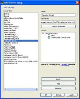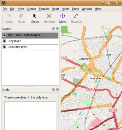 Die Karten-Ebene ist dazu da darzustellen, was im Hintergrund gezeichnet ist. Es gibt verschiedene Server, aus denen man wählen kann, zum Beispiel der Mapnik Tile Server oder der tile@home-Server. Wenn Ihre Installation von Merkaartor Webkit-Unterstützung hat, können auch Yahoo-Luftaufnahmen angezeigt werden.