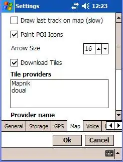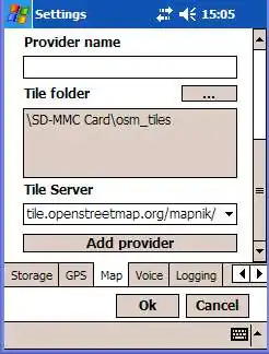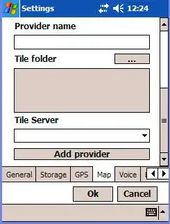 Um Einstellungen zu verändern, wählt man den Namen in der Tile providers Liste und klickt rechts (oder klickt und hält, abhängig vom PDA). Es erscheint ein Pop-up Menue mit Get, Delete ...
