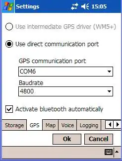 Wenn WM5 oder WM6 verwendet wird, wählen Sie 'Use intermediate GPS driver' (Nutzung des eingestellen GPS-Treibers), soweit Sie bereits Windows zur Nutzung ihres GPS eingerichtet haben. Andernfalls geben sie Port und Baud-Rate an und bestätigen Sie. (Für Bluetooth-Verbindungen ist die Baud-Rate unbedeutend, wählen sie nur eine hohe).