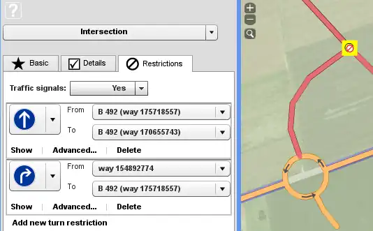 Mit dem Editor Potlatch 2 kann man folgendermaßen Abbiegevorschriften mit Hilfe von Relationen hinzufügen: