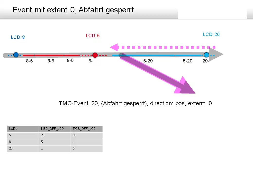 Die meisten Verkehrsmeldungen beziehen sich auf eine Point Location und geben von dort eine Richtung (Direction) und Ausdehnung (Extent) an. Ein Stau wird z.B. gemeldet als: "Von Location Code 54975 in negativer Richtung mit Ausdehnung 2". Zusätzlich kann auch die Länge des Staus angegeben werden.