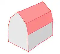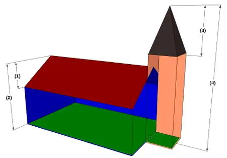 Das folgende Beispiel eines Kirchbaus besteht aus einem Gebäudeumriss (grün) und zwei Gebäudeteilen. Die zwei Gebäudeteile haben jeweils eine eigene Höhe (Kirchenschiff, blau; Glockenturm, beige) und Dachform (Giebeldach, rot; Turmspitze dunkelgrau). Die Höhe der Dächer ergibt sich aus der Differenz von Gesamthöhe und Traufhöhe. Im Regelfall können weitere Gebäudeteile (Querschiff, Seitenschiffe, Turmsegmente, Kapellen, etc.) hinzukommen. Zweckmäßigerweise fasst man diese dann in einer Relation zusammen. Aber auch hier gehen die Meinungen auseinander.