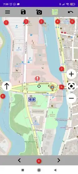 Straßenname Über die Position des Fadenkreuz wird der zugehörige Straßenname ermittlt. Dieser kann über den Eintrag unter der "0" (nach oben wischen) manuell geändert werden.