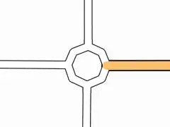 • Jede Straße muss mit dem Kreis in einem eigenen Punkt verbunden sein, d.h. zwischen diesen Punkten muss immer ein Segment des Kreises vorhanden sein. Dann können Router sicher erkennen dass ein Stück Kreisverkehr durchfahren werden muss.